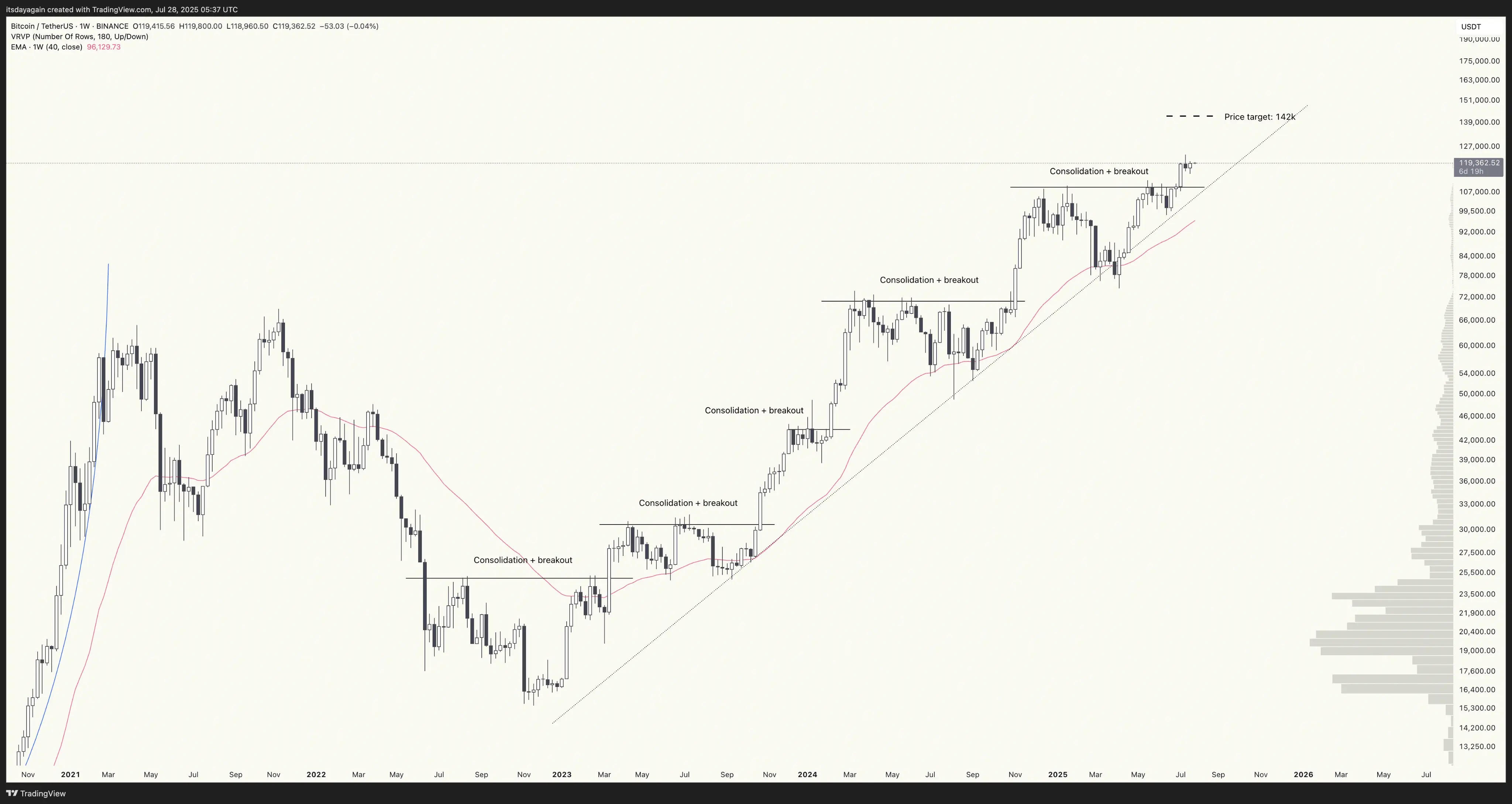 The fact that the market could absorb an enormous sale like this and still not move down much is a very good sign. Purely looking at the bitcoin chart, it tells the same story: very much still bullish, with a conservative price target of $142k.