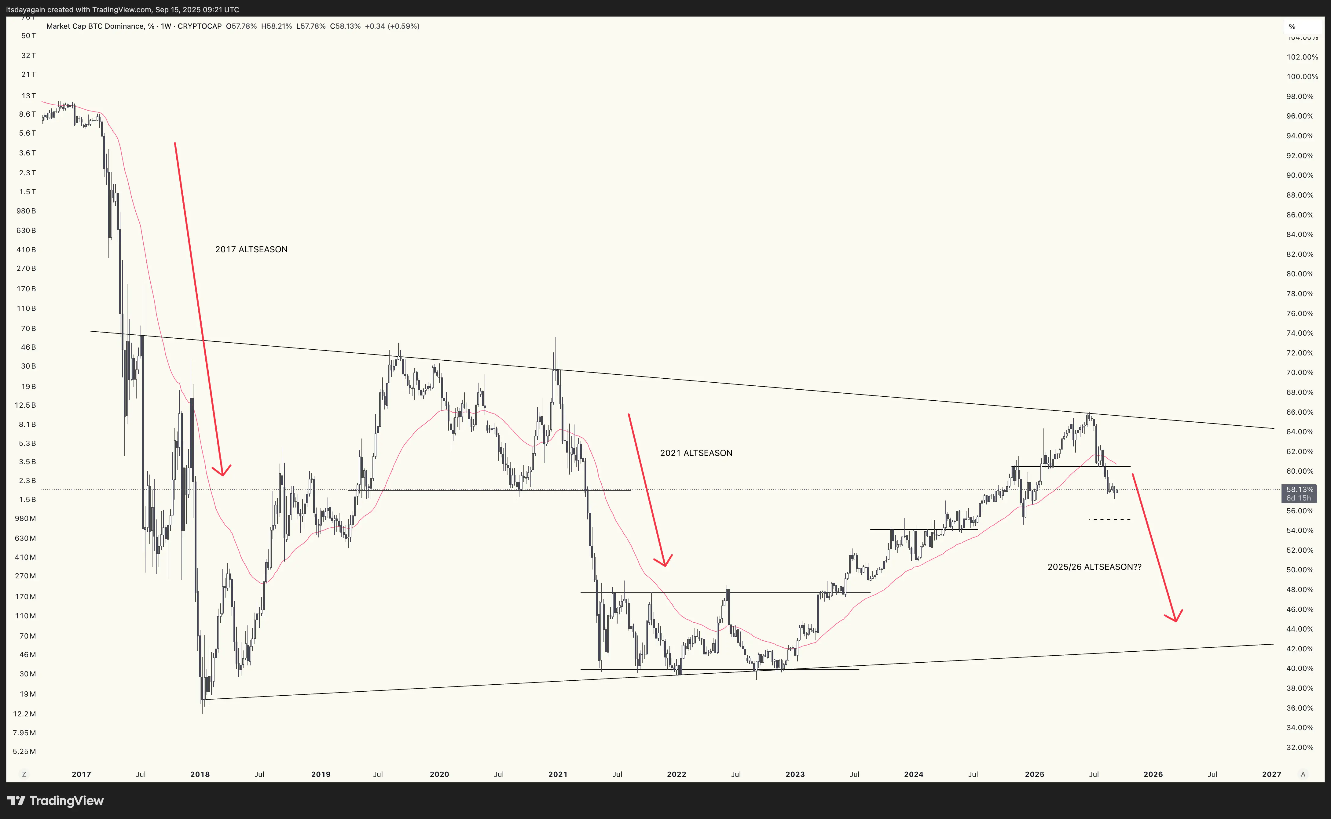 Bitcoin closed the week at $115.3k, continuing last week’s bounce from support at $109k. The breakout from early July is still in play, with a price target of $142k. Bitcoin dominance keeps trending down: altseason is still on!