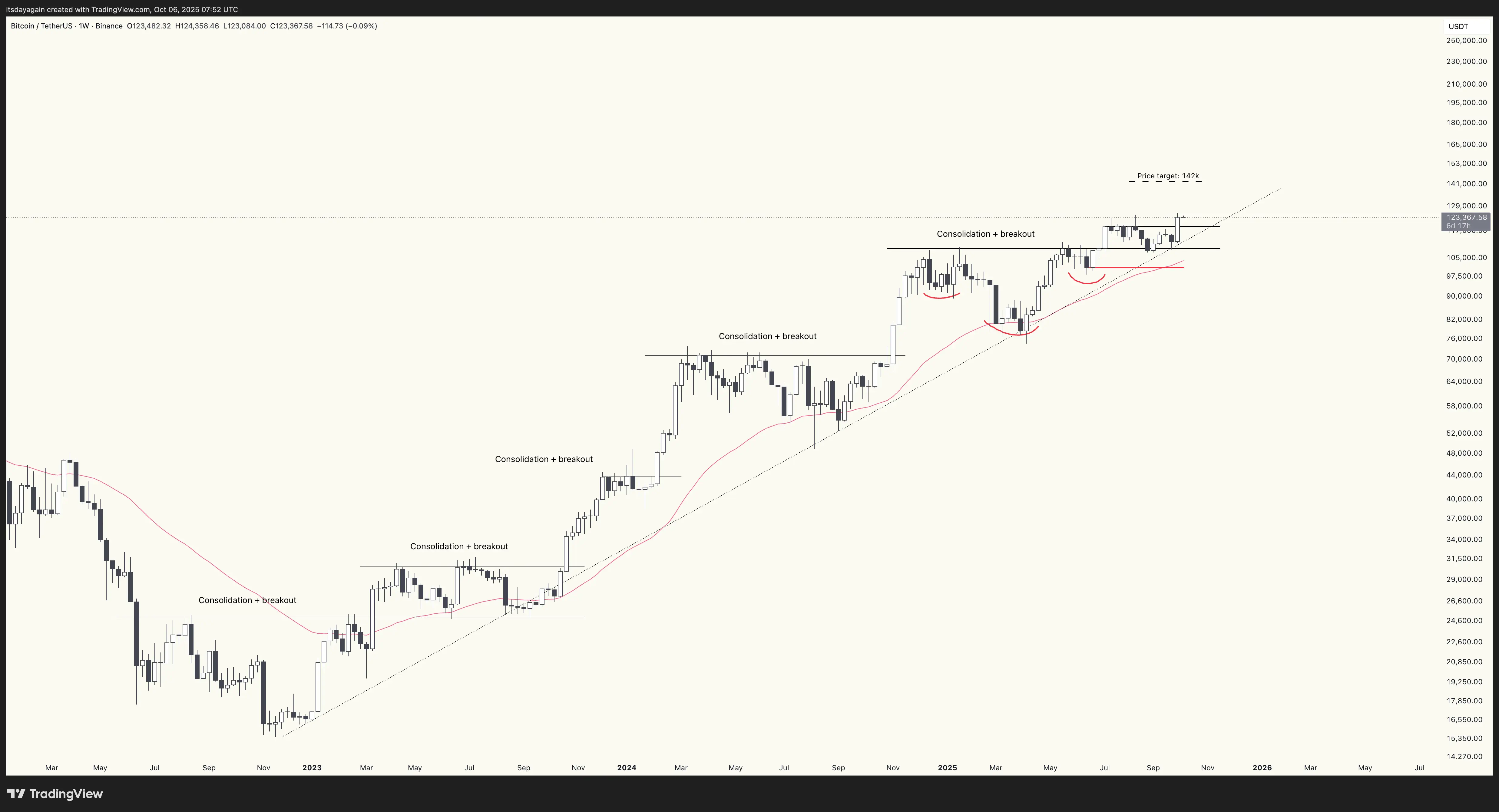 There is of course still the slight chance that this breakout will turn out to be a fake-out, leading to a new dump. But this is very much not the main scenario right now. Bitcoin breaking out into new highs is extremely bullish. Period. It can now continue towards the price target of $142k. Remember that I first set this target all the way back on July 13th, and I have maintained it every single week since then.