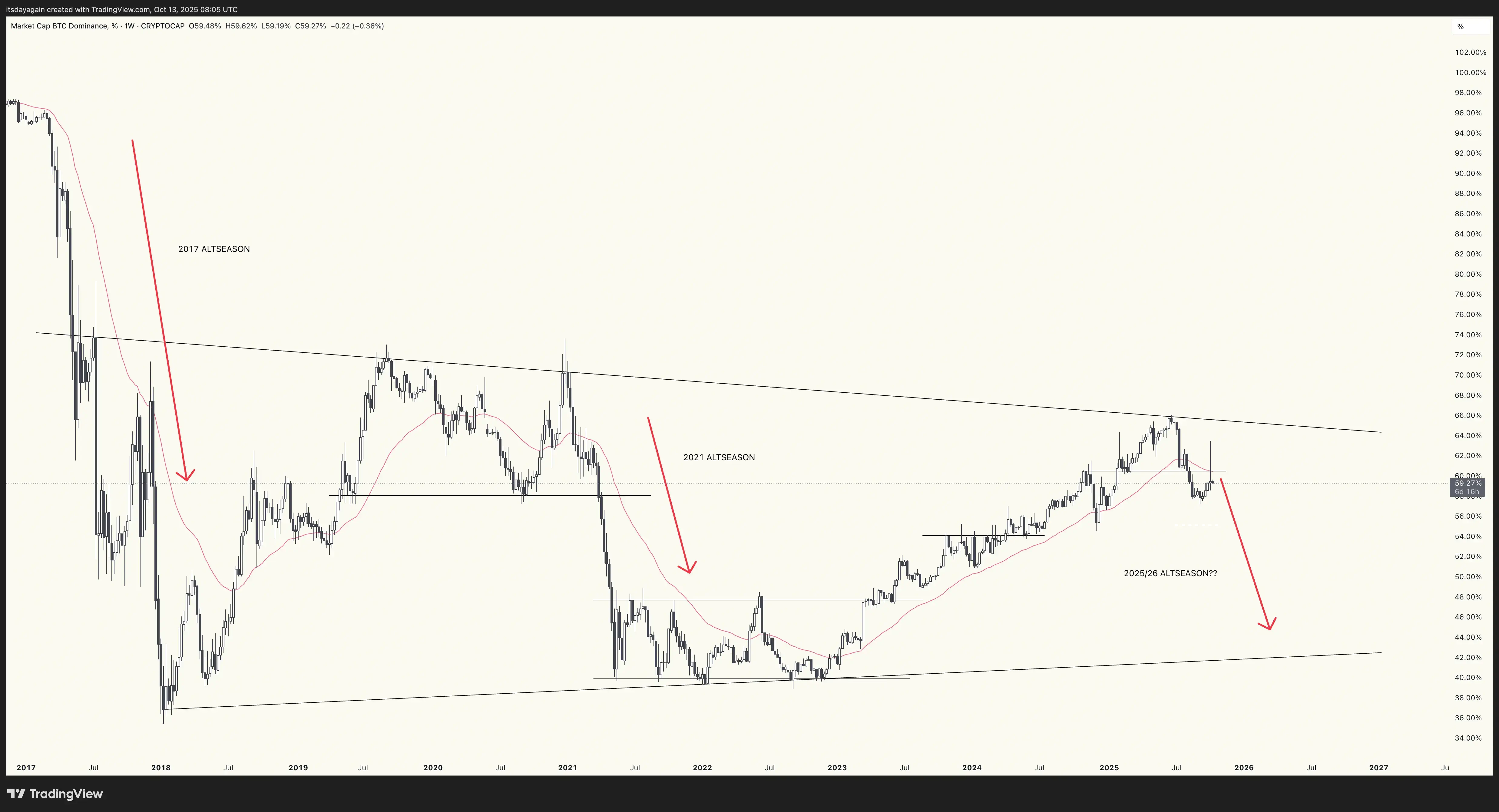 As altcoins were crushed on Friday, Bitcoin dominance (BTC.D) saw a sharp spike all the way up to 63.5%. However, it then quickly pulled back and closed the week at 59.5%, below the 40 week ema. This means the downtrend is intact, and altseason is still on.