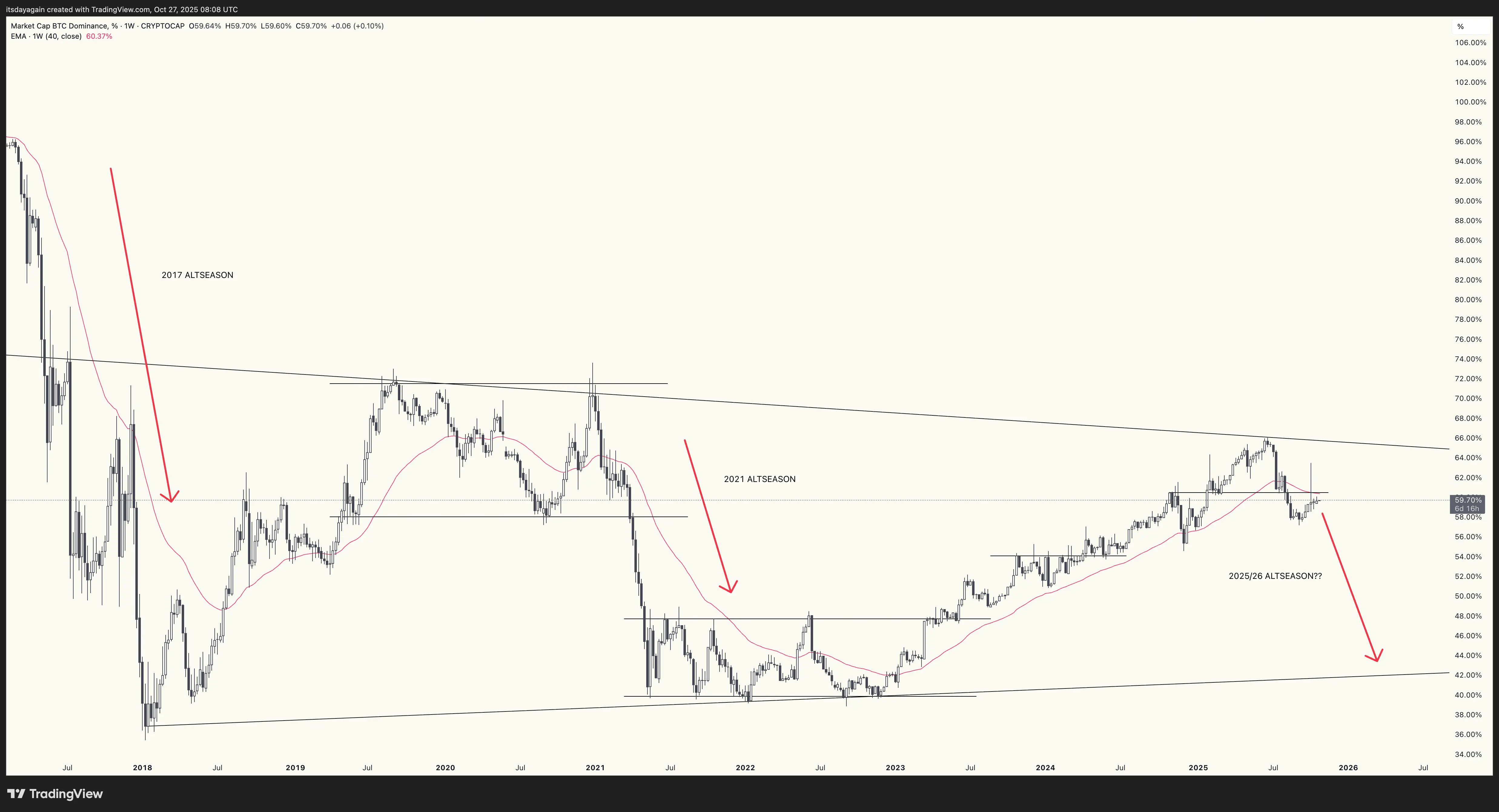 Bitcoin dominance has been hovering right below 60% for 3 weeks now, keeping altseason on pause. However, as noted last week, it’s still trending down, below the 40 week EMA. And until that changes, altseason is still alive.