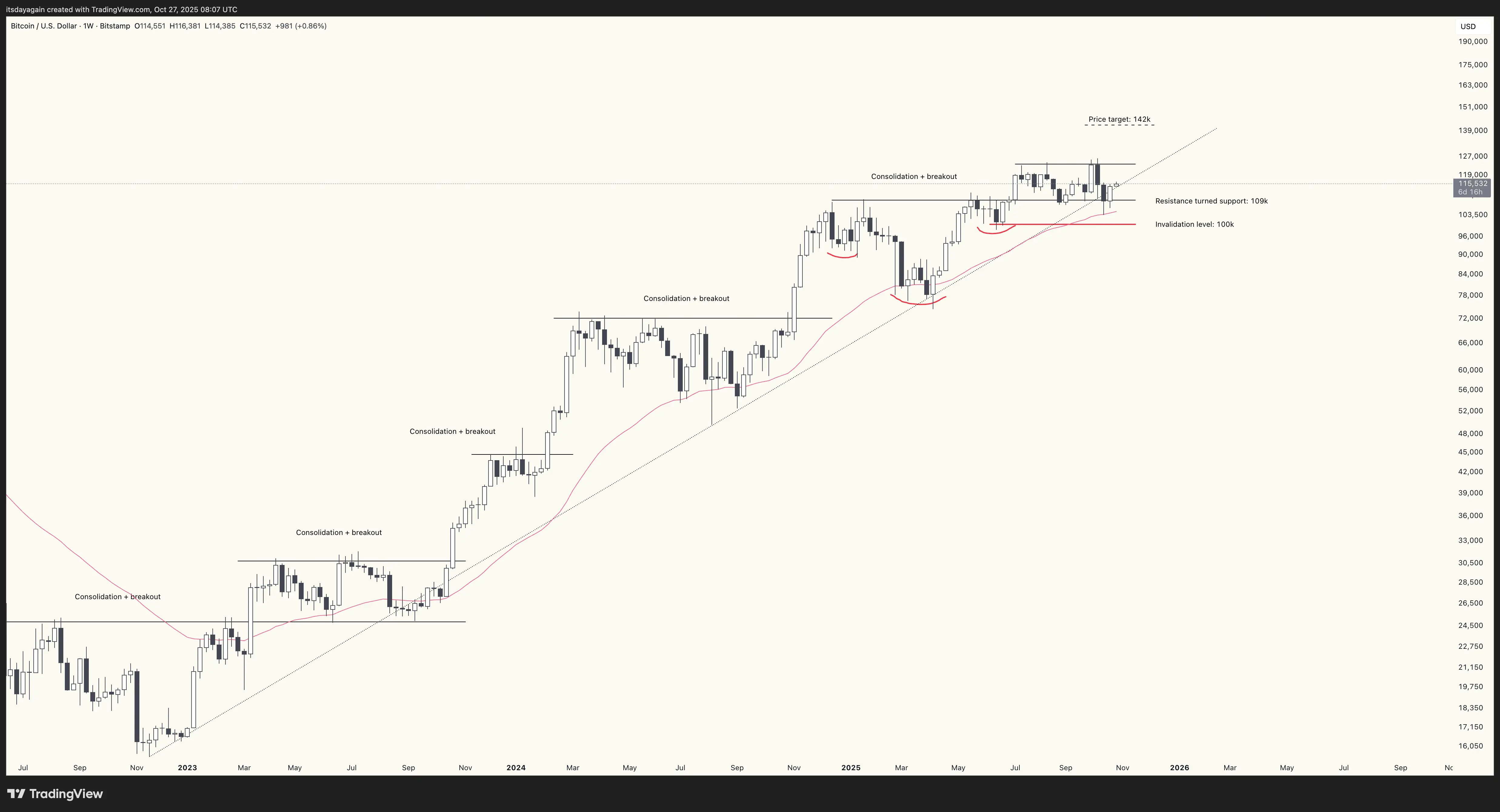 Looking to the bitcoin chart, the week closed at $114.5k, well above the old support at $109k where it closed last week. Bouncing from this support, in combination with strong stock markets, and ETF flows turning positive again, sets up a good base for a renewed rally into the end of the year. The conservative price target at $142k remains.