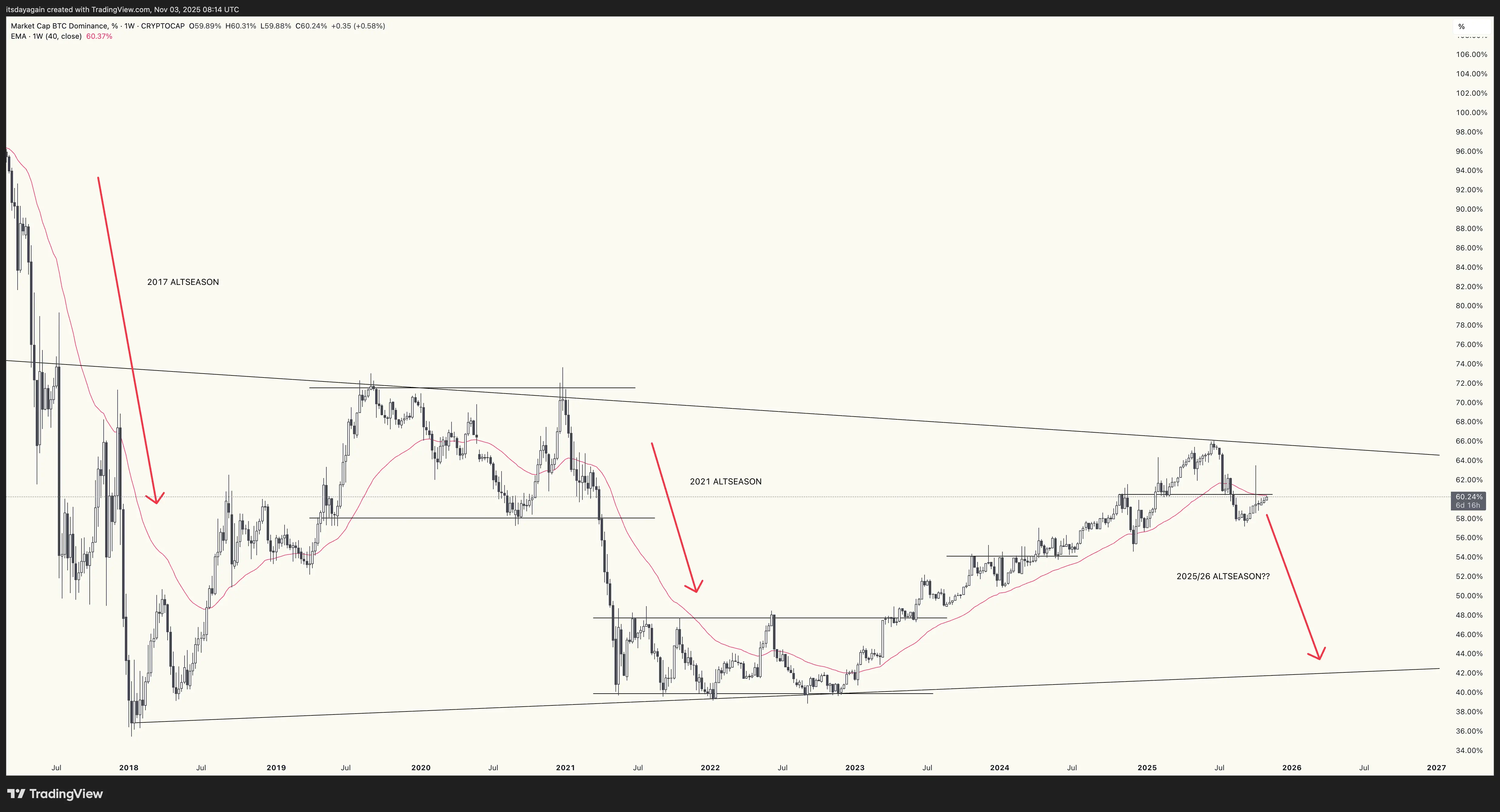 Bitcoin dominance climbed slightly this week, ending the week right below 60%. It’s now coming up against both the 40 week EMA, and the level from which it broke down in early August. If the real downtrend has indeed started, it’s now entering the territory where we could expect it to turn down again. But until it actually turns around, altseason remains on pause.