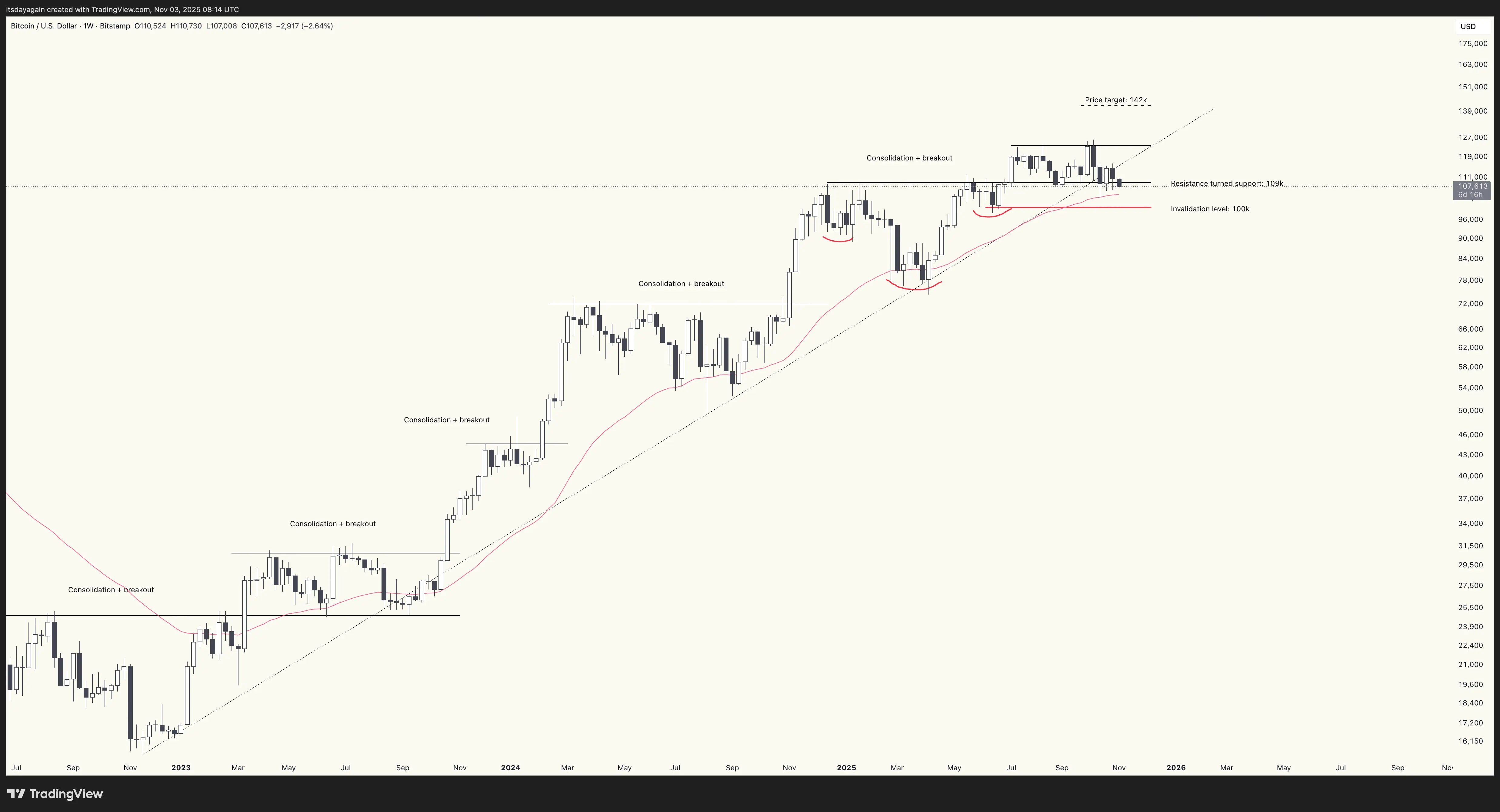 After a good start to the week, Fed chairman Powell came out to throw a bucket of ice at the party, cooling market expectations of further rate cuts. Bitcoin ended the week down, but still closed slightly above support at $109k, keeping the price target of $142k in play for now.
