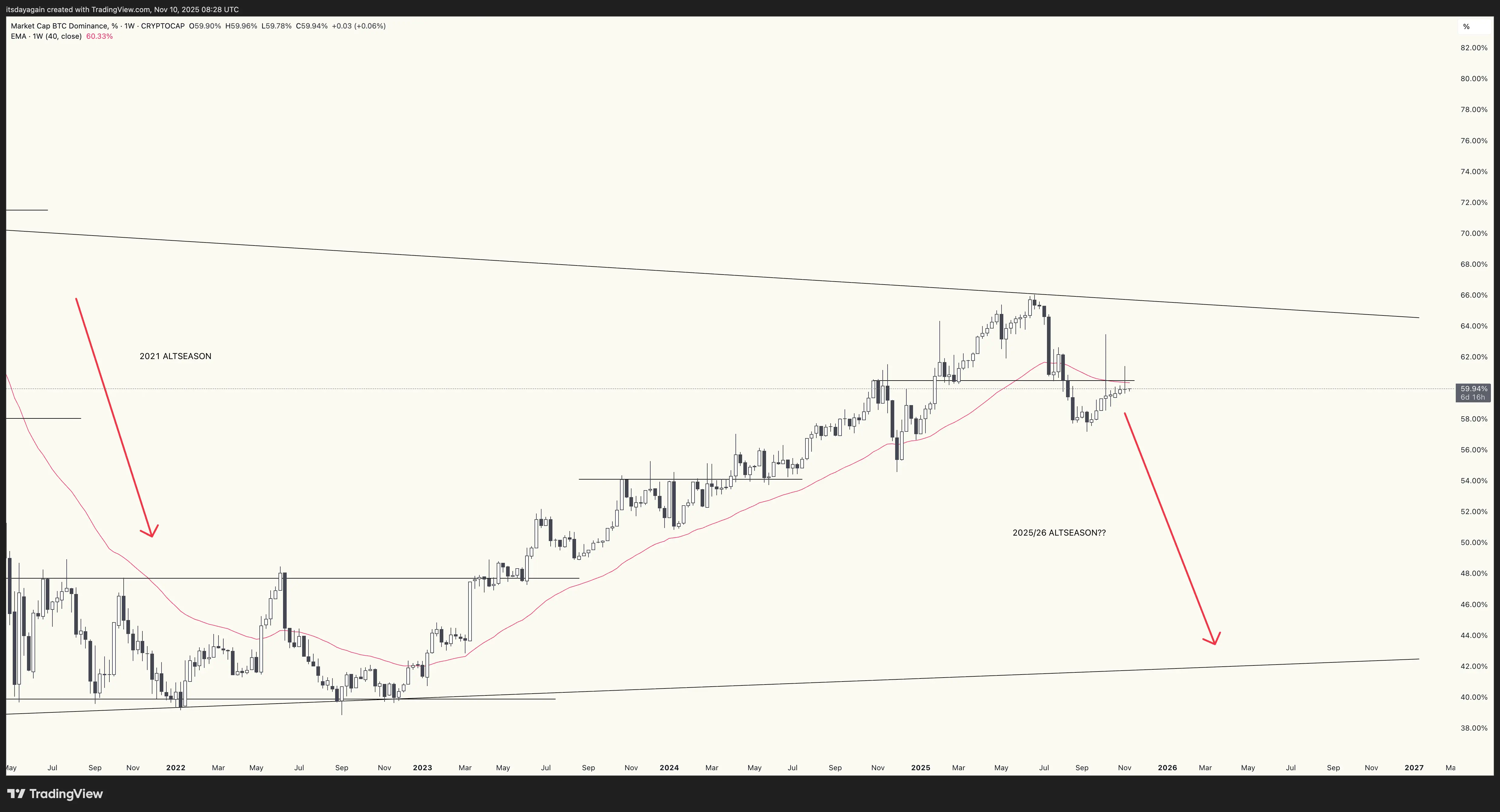 Bitcoin dominance ended the week flat, closing at 59.9% with a long wick to the upside. Prior support and the 40 week EMA are now acting as resistance. This would be a natural spot for dominance to turn down again, if the real downtrend has started. But until it does, altseason is on pause.