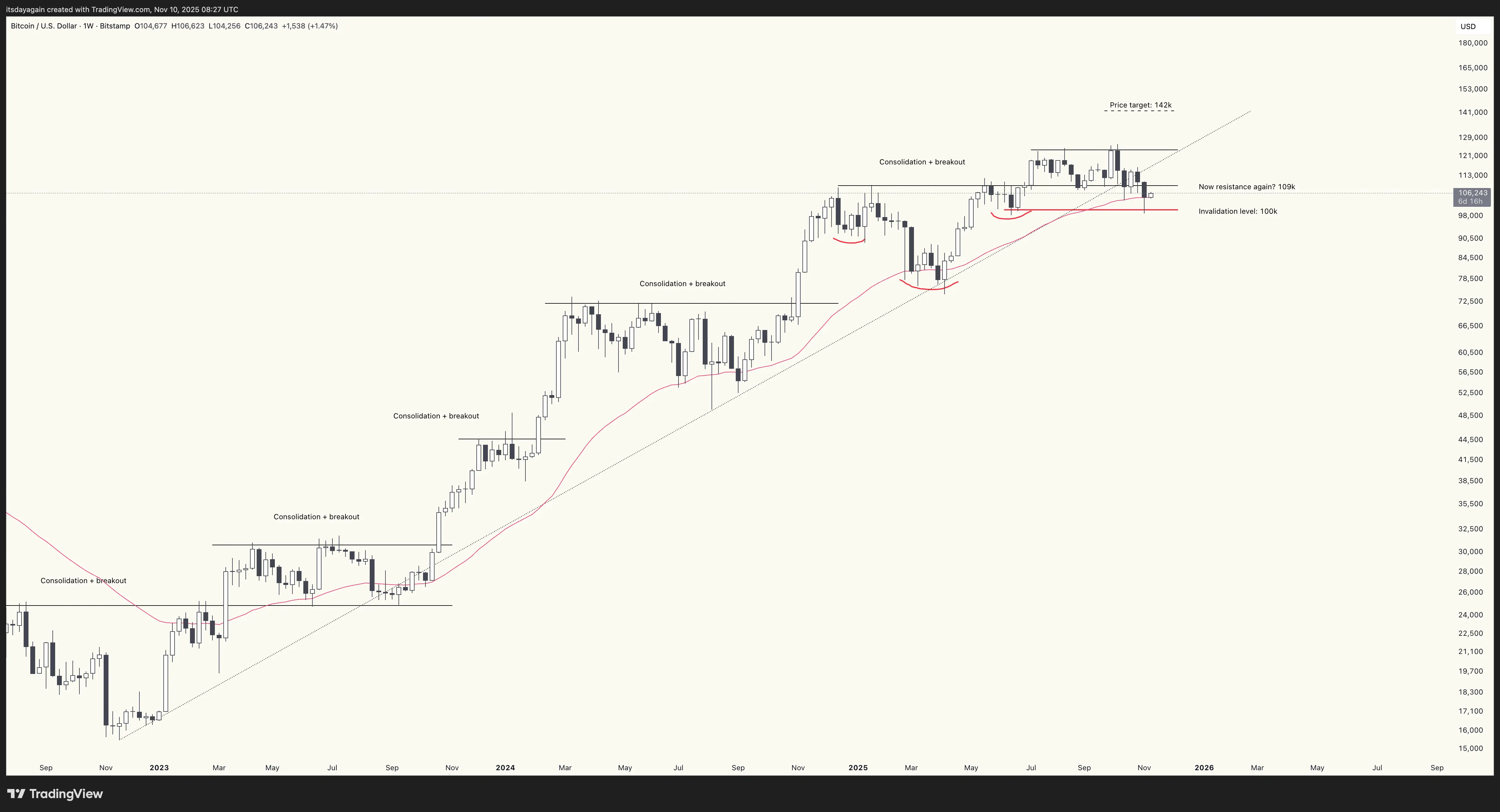 So with this in mind, it’s still too early to call a top in bitcoin. Staying above $100k means the price target at $142k remains, and closing above the 50 week SMA adds confidence that the top is not yet in.