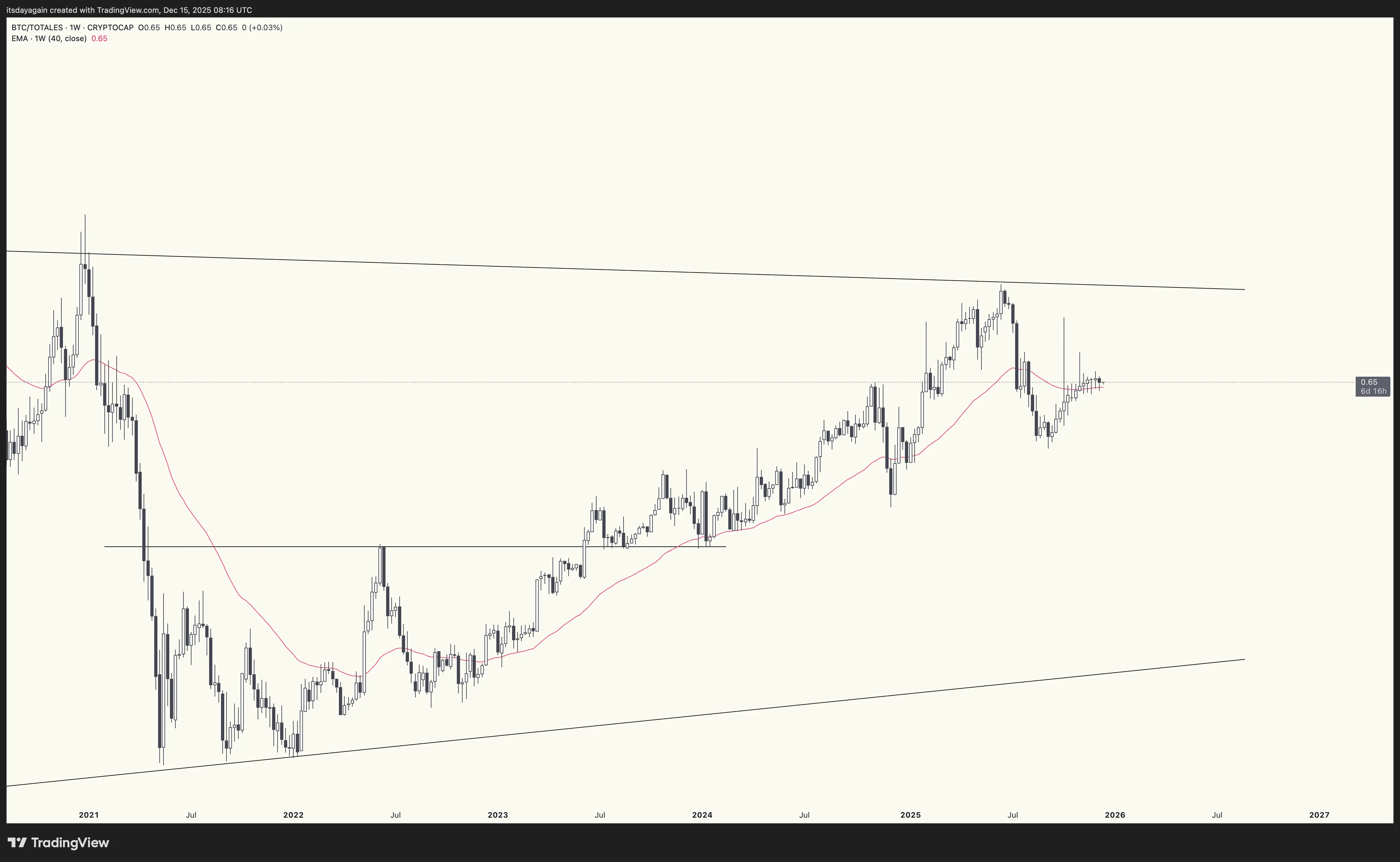 As for bitcoin dominance, I’m changing the chart to exclude stablecoins. This gives a more accurate picture of bitcoin compared to altcoins, which is the fundamental dynamic we seek to understand. Even with stablecoins removed however, the picture remains mostly the same: bitcoin dominance has been confined to a narrow range over the past month. At some point it will make a sharp move, either up or down. But until it does, all we can conclude is that altseason stays on pause.