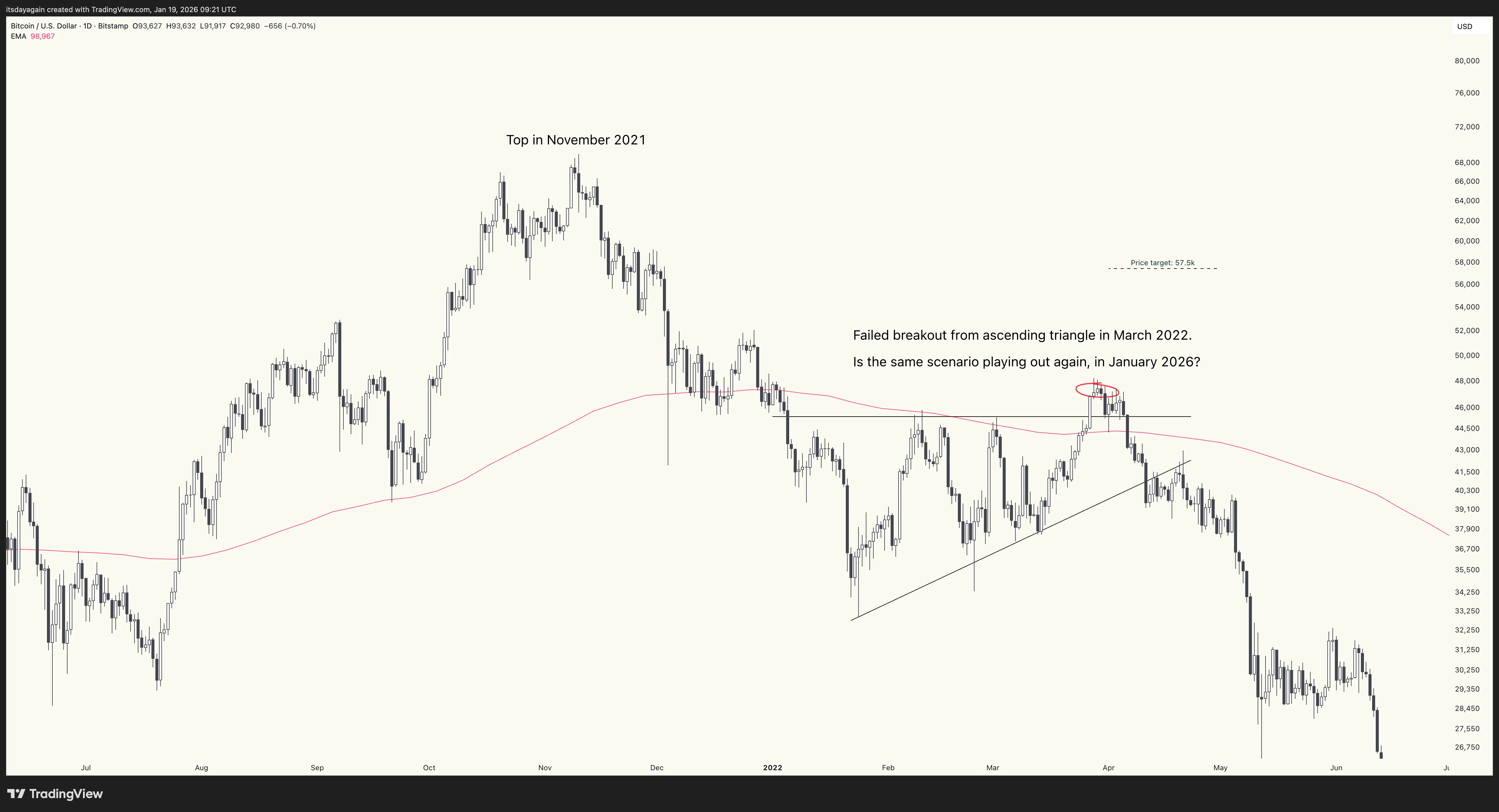 While silver and gold are rallying, Bitcoin is clearly not living up to its promise as a risk-off inflation hedge. Last week I wrote about how similar the bitcoin chart is now, compared to how it played out after the top in 2021. This week the similarity continues: the ascending triangle has failed, showing more weakness.