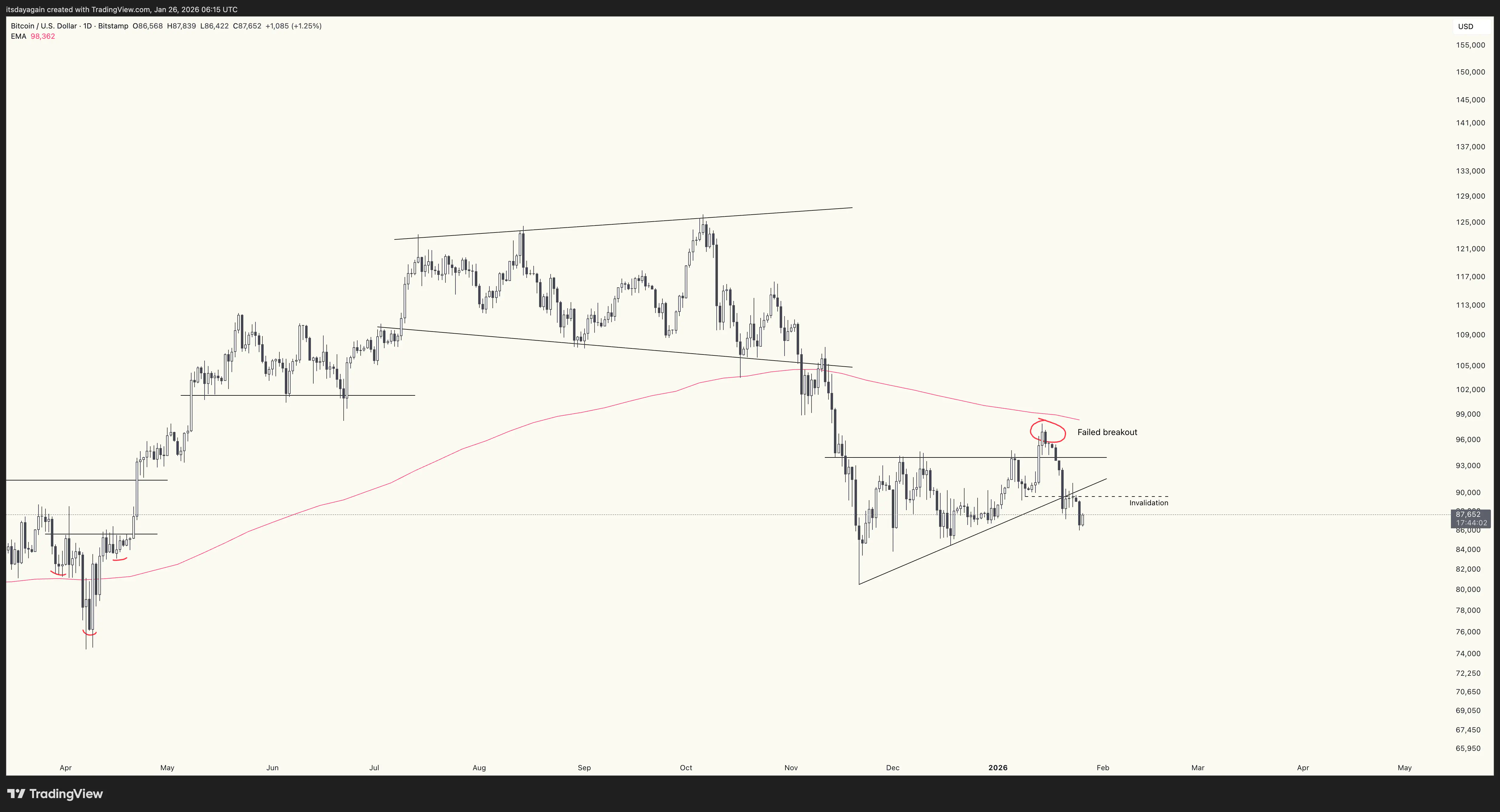Let’s have a quick look at the weekly chart first, which is still consolidating after the breakdown in November. It now looks increasingly likely that 98k was the top of the bounce, and a lower low is coming up next. This has been the base case all along since the breakdown. Major technical support is at 72-76k, so that’s the logical place to watch for a lower low.