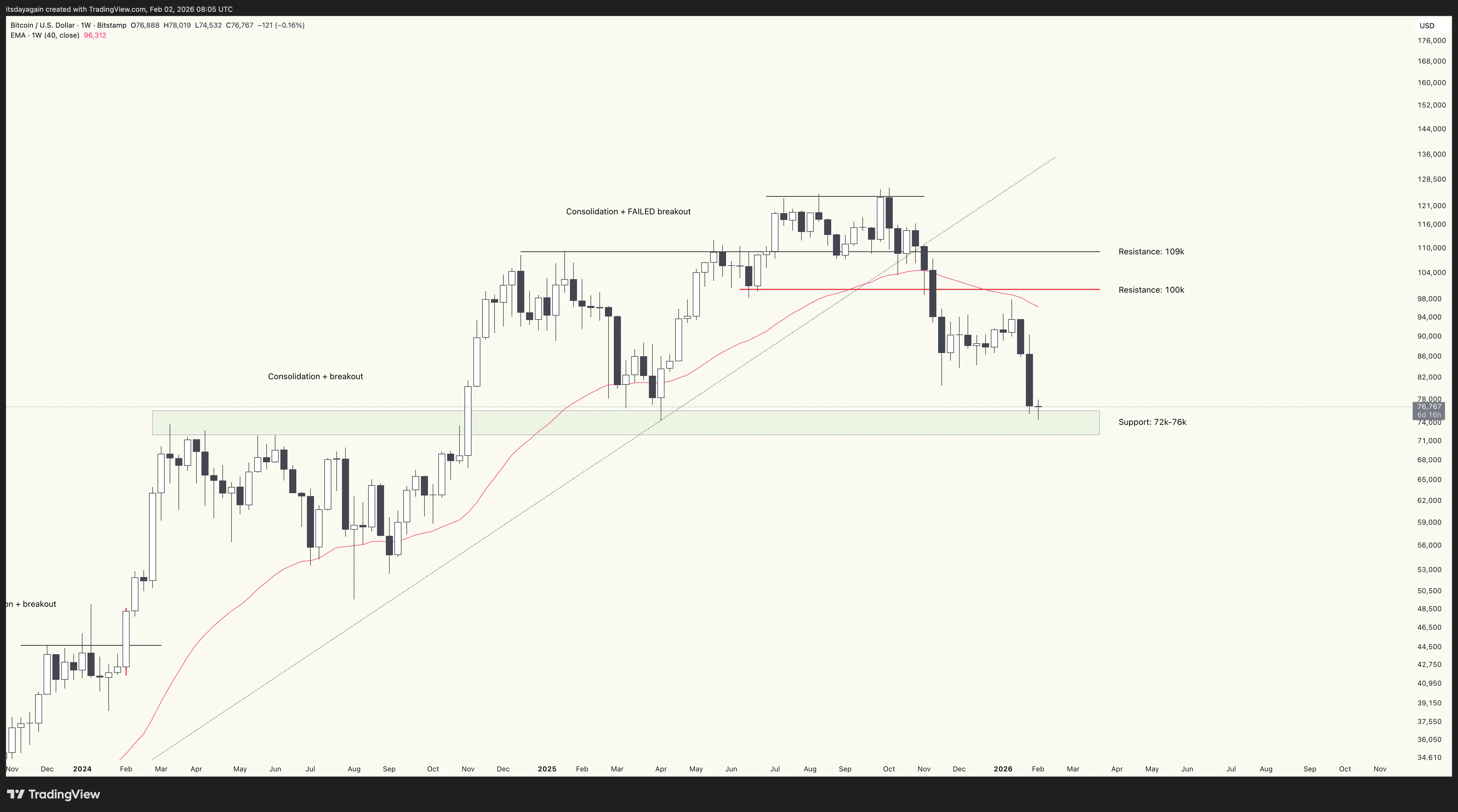 Markets sold off across the board late last week, with silver recording its biggest ever daily drawdown in history on Friday, as it crashed from an open at $115 to a close at $85. On Saturday, bitcoin followed down into a lower low. It’s now testing the area around $75k, where it is likely to find at least short term support.
