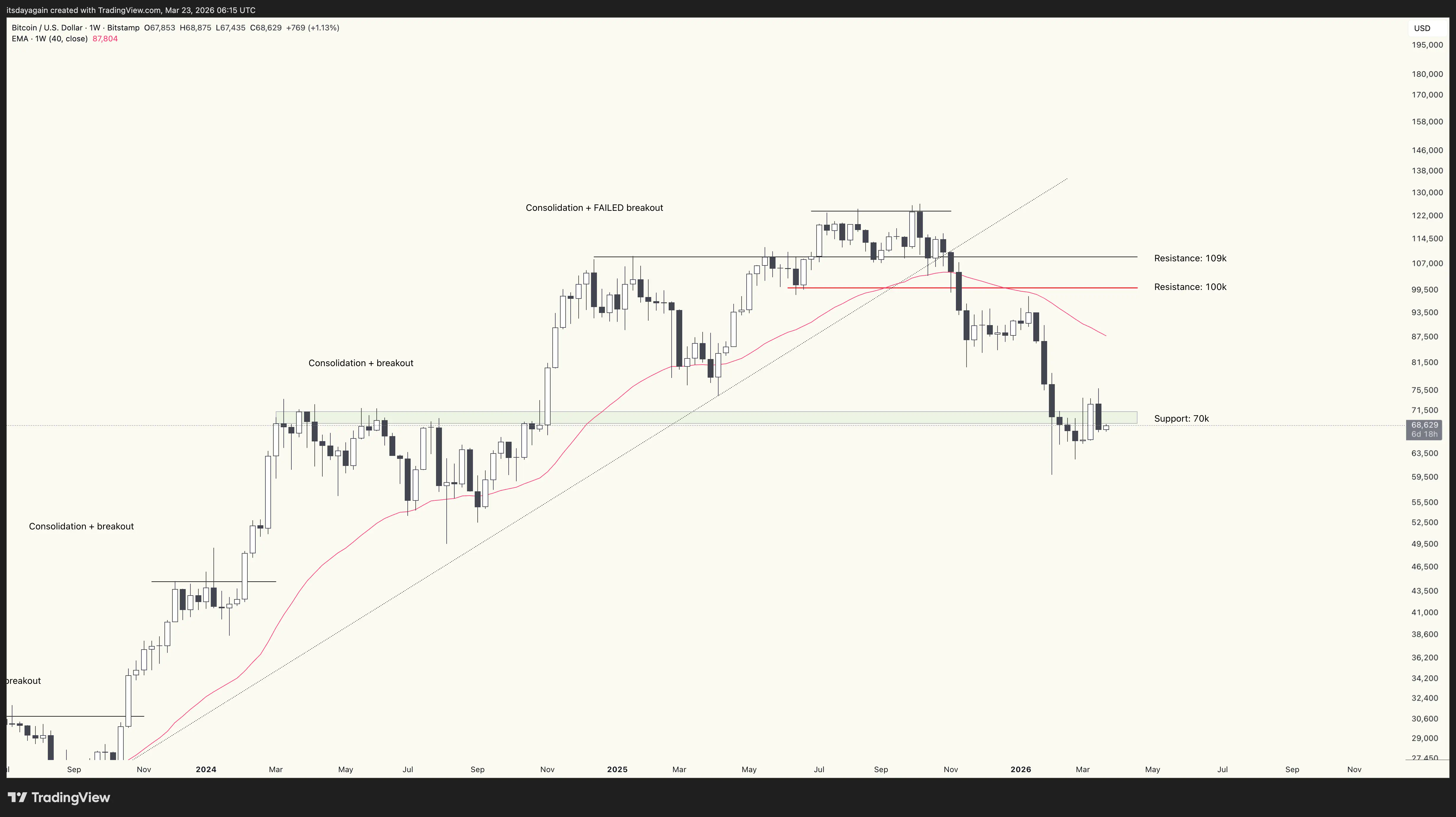 On the weekly, bitcoin closed below 70k support again. It might be that this area is now turning from support and into resistance.