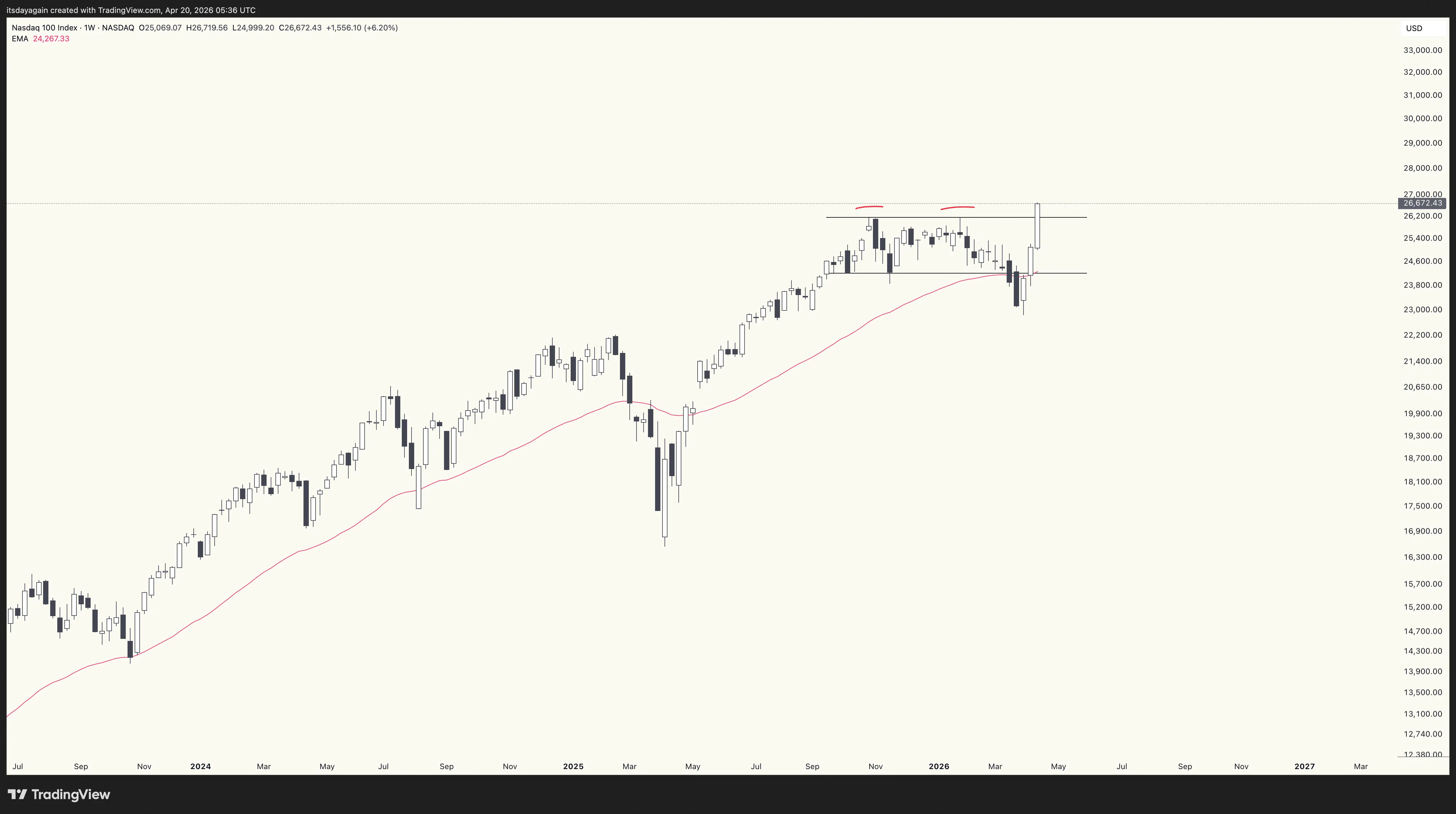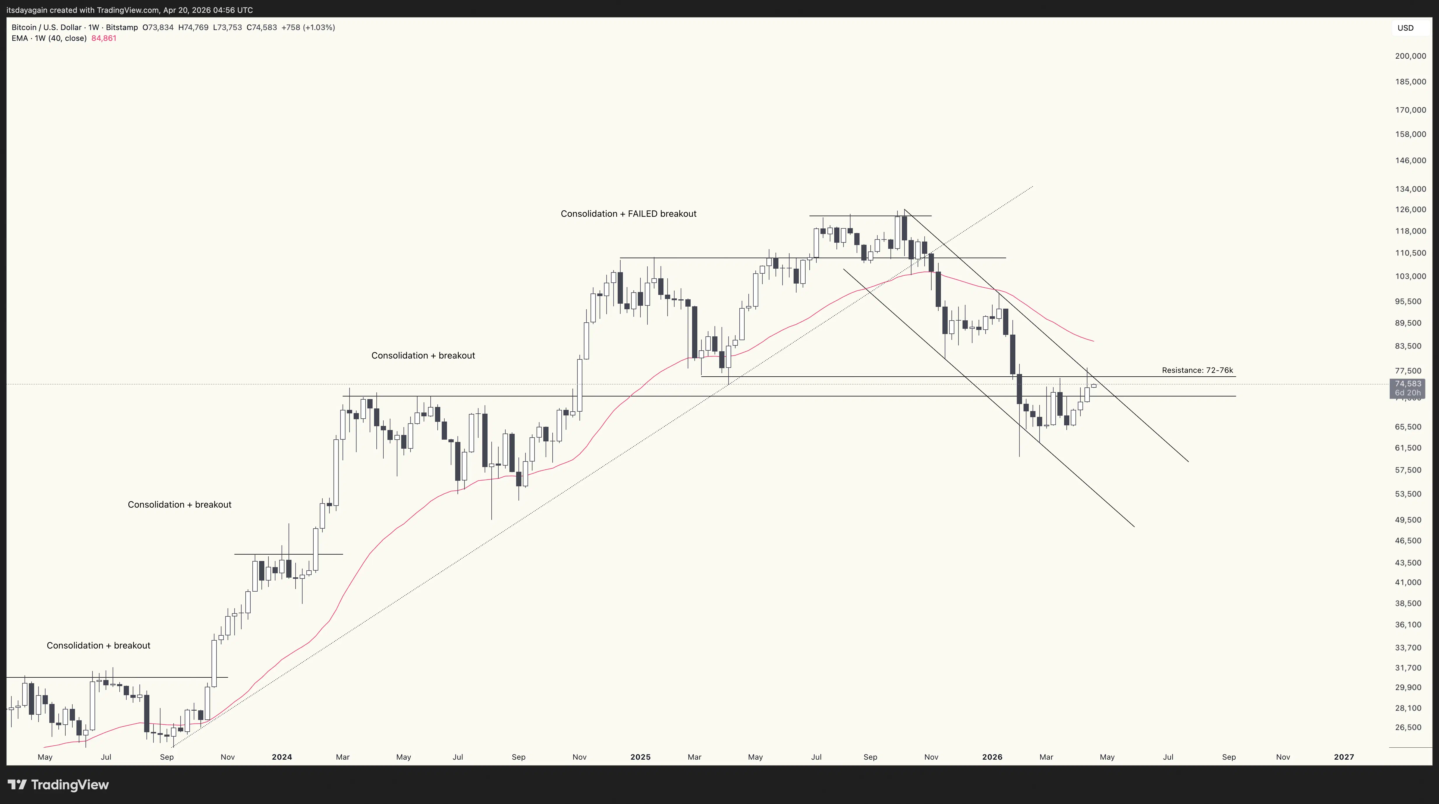 This week, I’ve added a resistance line at 76k, going back to the swing low in early April 2025. Right now, this level also coincides with resistance from the upper edge of the channel. Meaning that a break above 76k also would be a break out of the channel. This would be a sign of strength, so that’s something to watch out for. However, even if that were to happen, the 40 week average is still up above, sitting at around 85k this week.